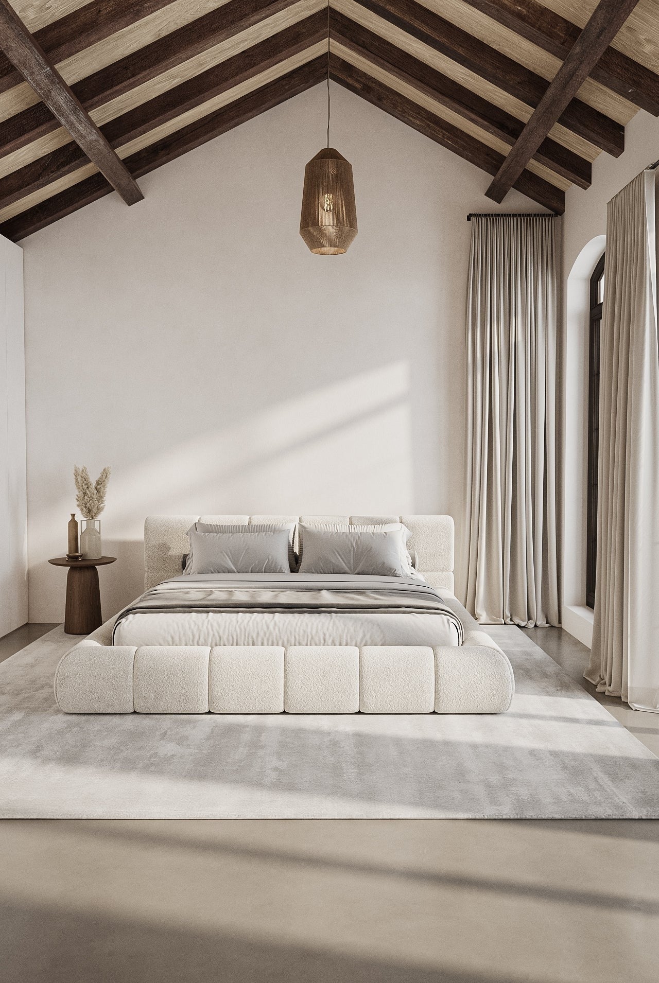 Transform your bedroom with this bold and contemporary bed in a striking deep and light tones. Featuring a plush, tufted design that wraps around the base and headboard, it adds a luxurious and cozy feel to any space. The low-profile silhouette and sophisticated color make it a statement piece that complements both modern and minimalist interiors.
