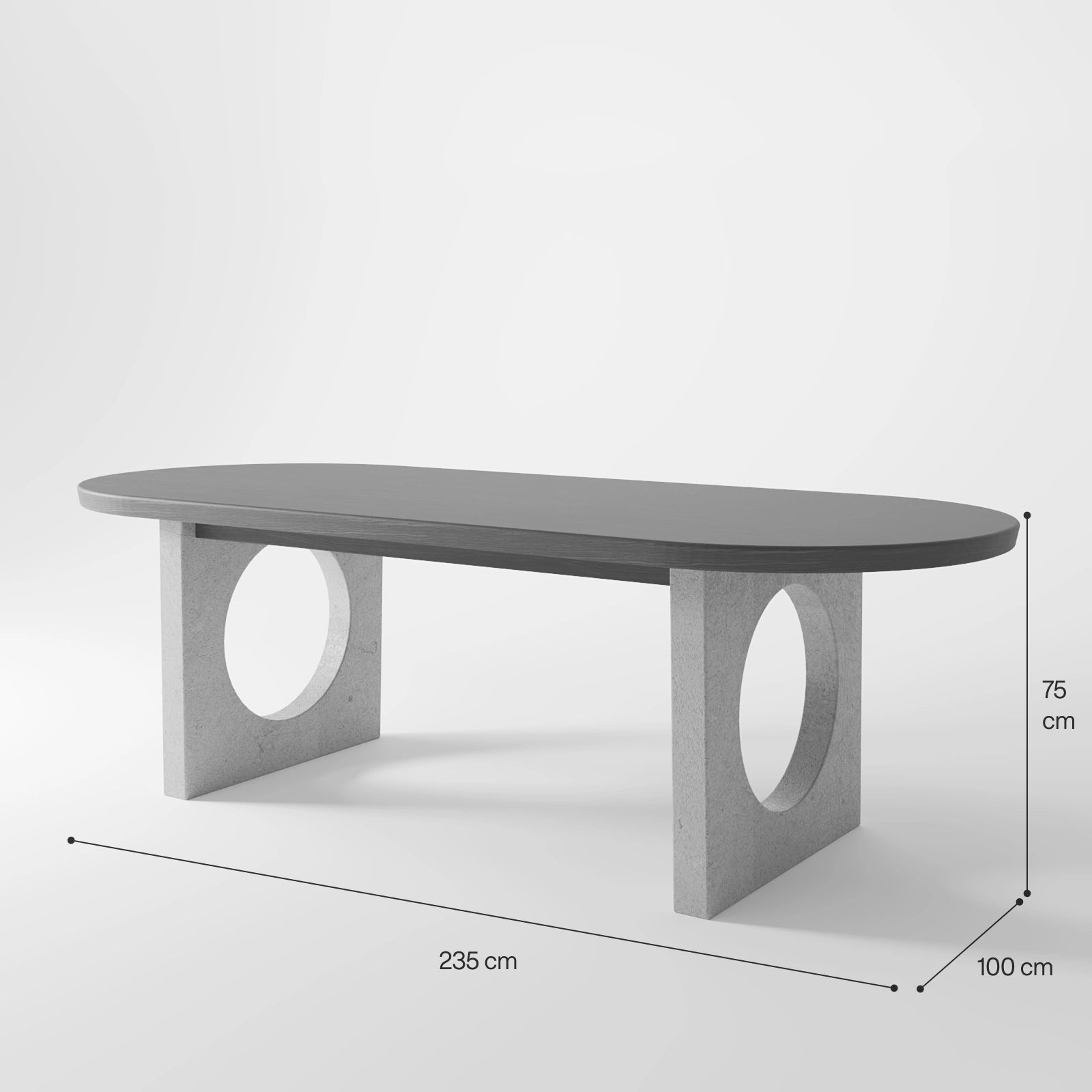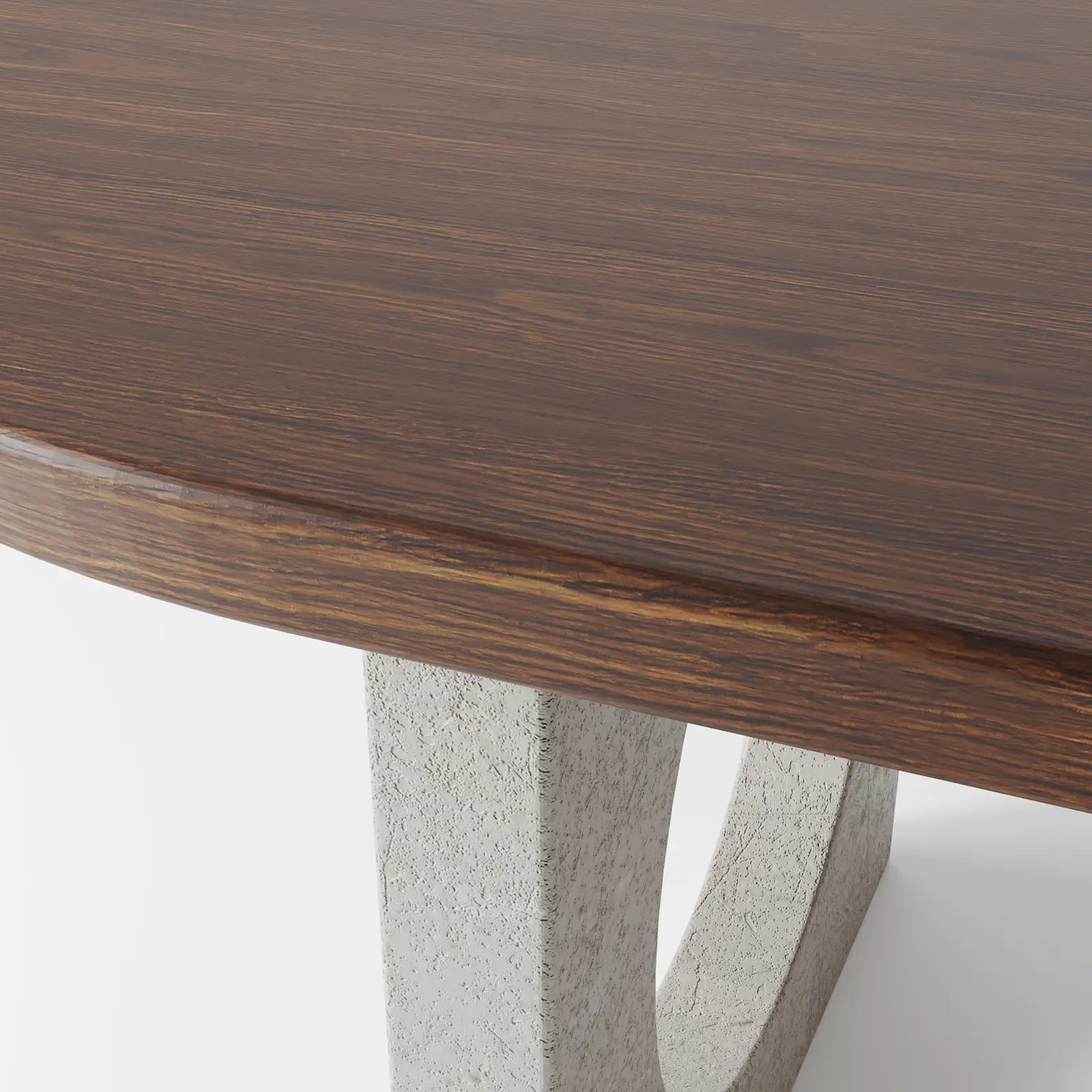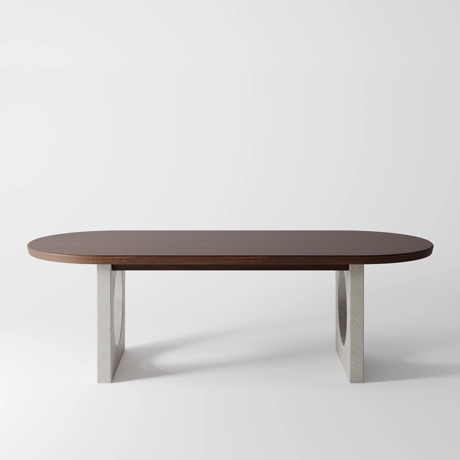 The Como Dining Table is a beautifully designed piece, crafted to seamlessly blend contemporary style with artistic sophistication. Its striking design features a walnut wood top paired with a concrete base, creating a bold yet refined statement for your dining space. The unique structure, with two square legs and a circular centerpiece framed by curved, rectangular shapes, makes it a true conversation starter.