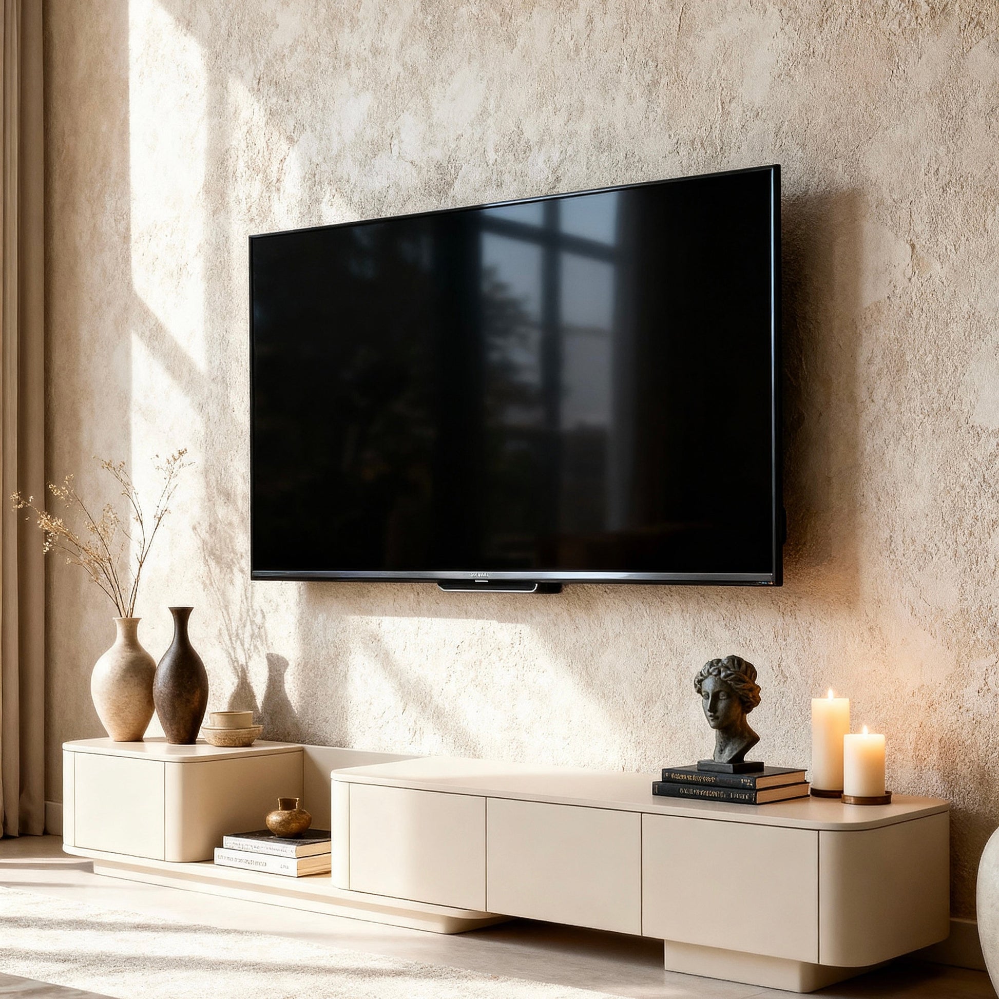 The Evita TV Stand is a beautifully designed piece that blends modern elegance with exceptional functionality. Crafted with a mix of off-white, white, and walnut veneer, it features a sleek, round-edged design that not only adds a sophisticated touch to your living room but also provides protection against scratches. Its minimalist frame, combined with a versatile free-moving feature, allows for seamless placement in any space.