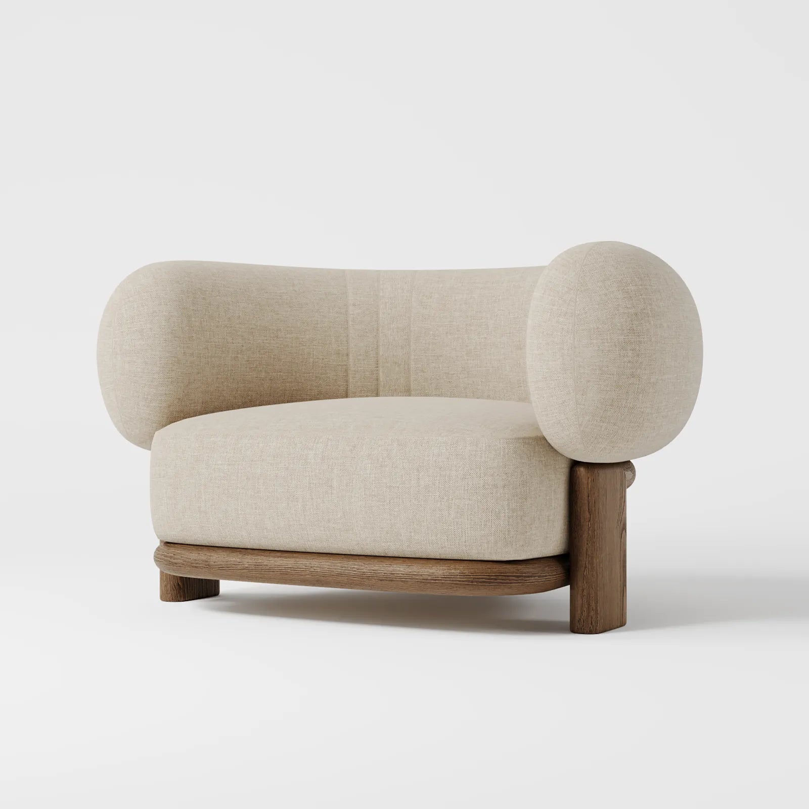The LuxeCurve Rest Armchair is designed for exceptional comfort and style. Its elegant U-shaped arms create a seamless silhouette, blending perfectly with the curved backrest for a sophisticated look. The armchair is supported by three beautifully crafted walnut legs, providing a sturdy base with a refined touch.