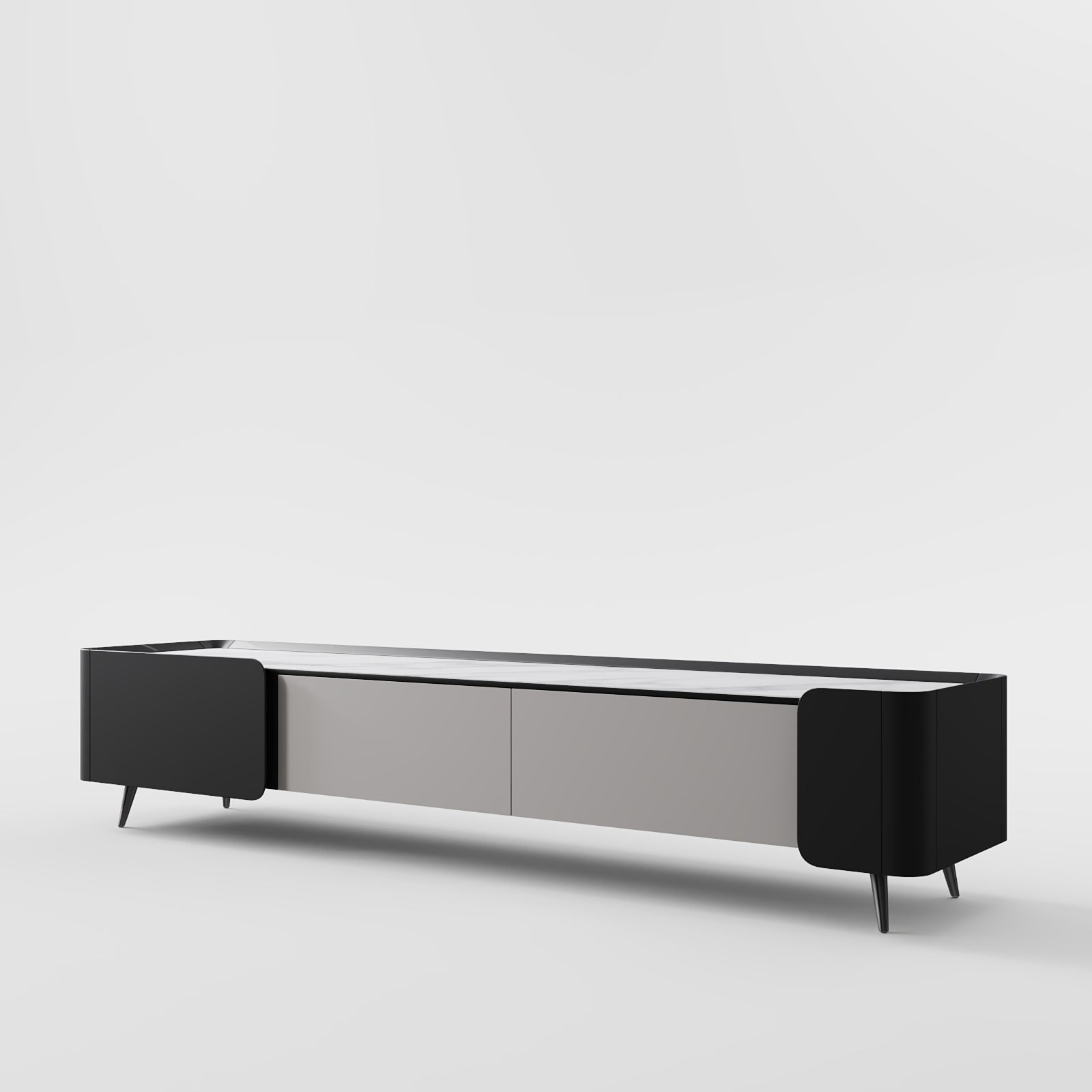 The Urban TV Stand is a beautifully designed piece, crafted to seamlessly blend modern style with exceptional functionality. Its clean, low-profile design features a sleek black veneer finish and a durable sintered stone tabletop, making it the perfect addition to any living room. With ample storage for your media devices and a minimalist frame, it enhances your entertainment setup while adding a touch of refined elegance.