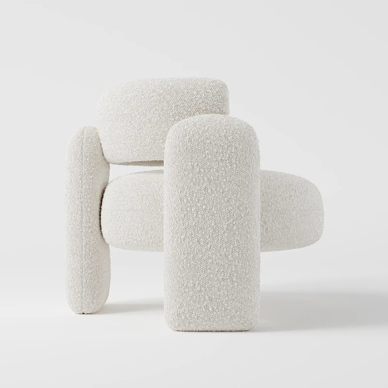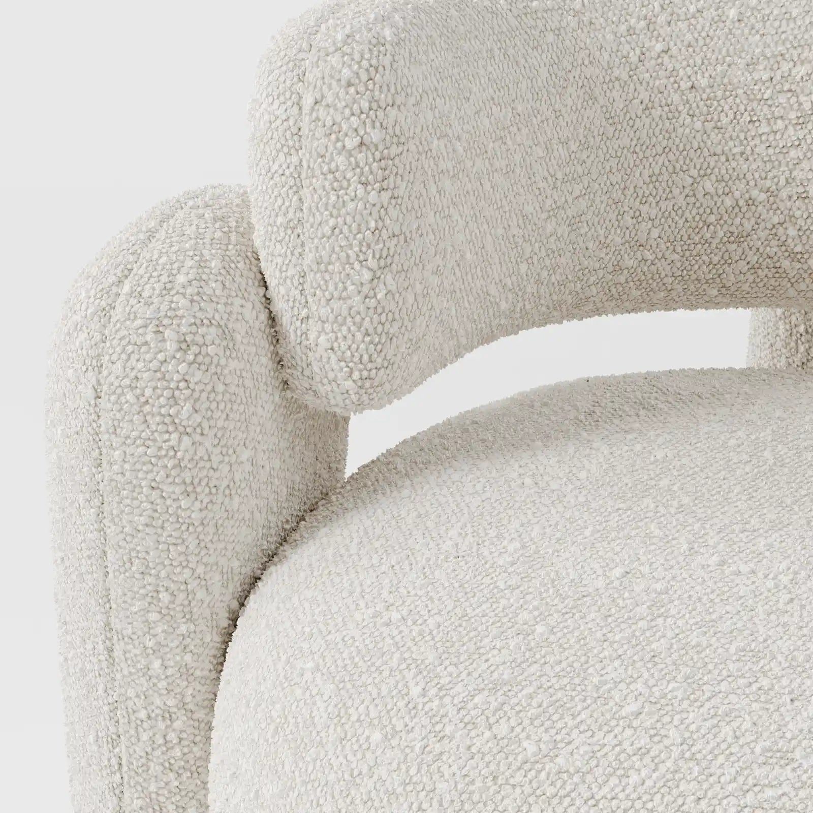 The Vortex Boucle Armchair embodies modern luxury, seamlessly blending style and comfort. Upholstered in premium white boucle fabric, its graceful curved arms and open-bottom design bring a sense of lightness and sophistication to any room. Supported by three sleek, floor-to-back legs, this chair features a striking architectural aesthetic that sets it apart as a statement piece.