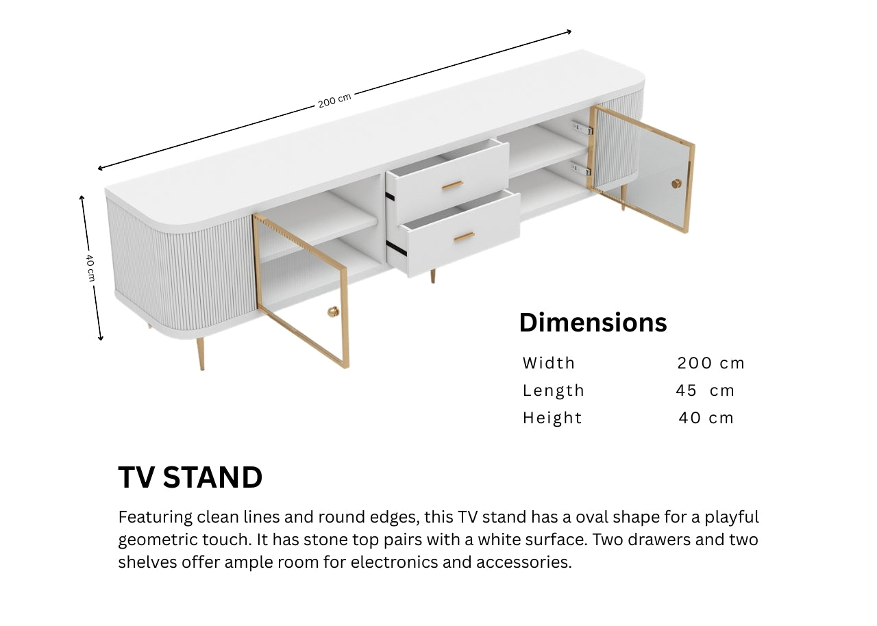 Эта роскошная тумба под телевизор – идеальное сочетание современного дизайна, изысканности и вневременной роскоши . Благодаря элегантной белой каменной столешнице она добавит изысканности вашей гостиной. Тумба оснащена двумя вместительными ящиками и двумя открытыми полками , обеспечивая достаточно места для хранения электроники, медиаустройств и аксессуаров, сохраняя при этом пространство. Эта универсальная тумба, доступная в белом и черном цветах , дополнит любой интерьер, от современного до классического. Плавные линии, высокое качество изготовления и практичный дизайн делают её не только функциональным решением, но и воплощением роскоши и элегантности в вашем доме.
